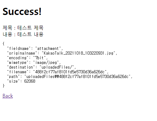폼 제출 성공시, 보여지는 화면이다. 제목과 내용, json 형태로 된 file의 정보를 보여준다.