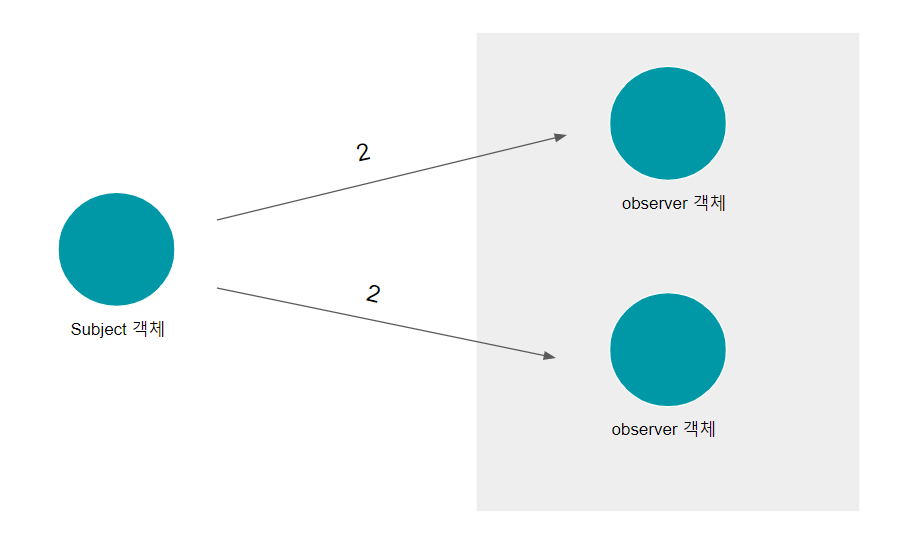 - 주제(Subject)객체의 데이터가 달라지면 옵저버한테 2가 전달된다.